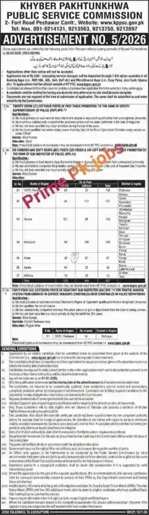 KPPSC jobs 2026 Advertisement No.05/2026 have been recently Published through the newspaper daily Aaj.Eligible and professional male and female candidates holding domicile of Khyber Pakhtunkhwa are invited to apply online for the following multiple vacant posts. Recruitment to these positions will be made on a regional and merit basisThese vacancies currently include Deputy Superintendent of Police (DSP), Sub-Inspector of Police, and Assistant Sub-Inspector.The department requires hardworking and competent personnel for these positions.The aforementioned posts will be filled strictly in accordance with the allocation specified in the advertisement. Interested candidates who meet the required eligibility criteria may submit their applications online through the prescribed form available on the Commission’s website www.kppsc.gov.pk by the closing date mentioned above.Details regarding educational qualifications, upper age limit, and number of vacancies are provided below.