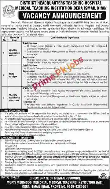 Mufti Mehmood Memorial Medical Teaching Hospital DI Khan jobs 2026