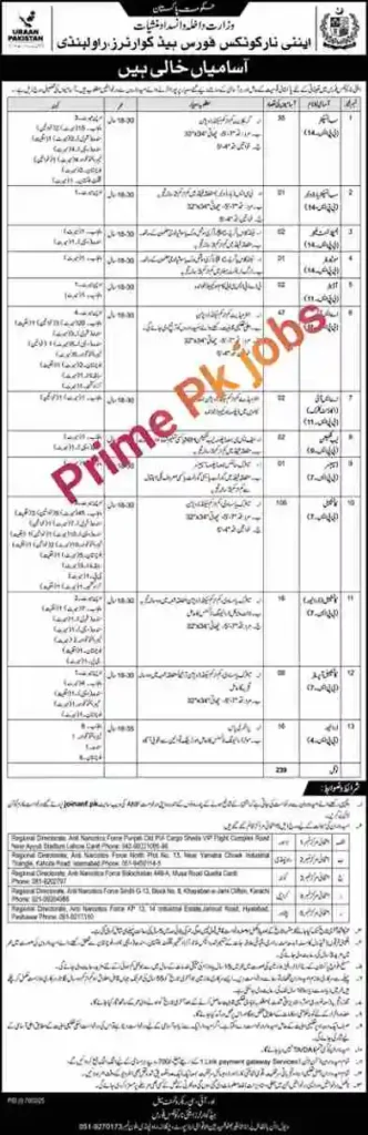 Pakistan Anti Narcotics Force is offering these employment opportunities on an equal opportunity basis.Women, persons with disabilities, and members of minority communities are also encouraged to submit their applications.The quota for persons with disabilities will be allocated and implemented in accordance with government rules and regulations.