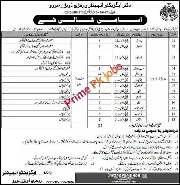 On this page, we will provide you with complete information about the Sindh Irrigation Department Moro jobs 2026.The information regarding these Government of Sindh jobs has been collected from the Daily Express newspaper.Applications for these non-technical positions are invited from candidates holding local domicile of District Naushahro Feroze.Individuals who meet the eligibility criteria for the posts are eligible to submit their applications.